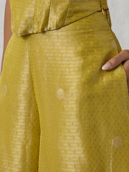 These yellow palazzos are tailored in a sweeping wide-leg silhouette that exudes movement and fluidity. Crafted in a lustrous textured fabric with subtle woven motifs, they shimmer beautifully, making them perfect for celebratory occasions. Designed with a flattering mid-rise fit and a flowy drape, they pair seamlessly with festive tops, structured blouses, or coordinated overlays.