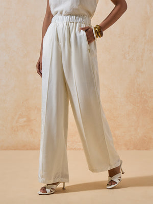 Elevate everyday dressing with these white trousers, designed in a wide-leg silhouette for fluid movement. Crafted from a lightweight fabric with a subtle sheen, they feature a high elasticated waistband for comfort. Side pockets complete the look, making them a versatile pair that transitions effortlessly from casual edits to evening sophistication.