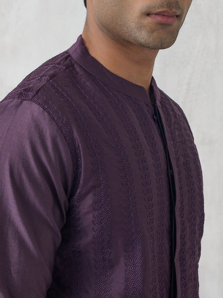 Add festive finesse with this purple kurta from Samoh, designed with alternating woven panels and solid fabric for depth. Styled with a band collar and long sleeves, it transitions effortlessly from day ceremonies to evening gatherings.